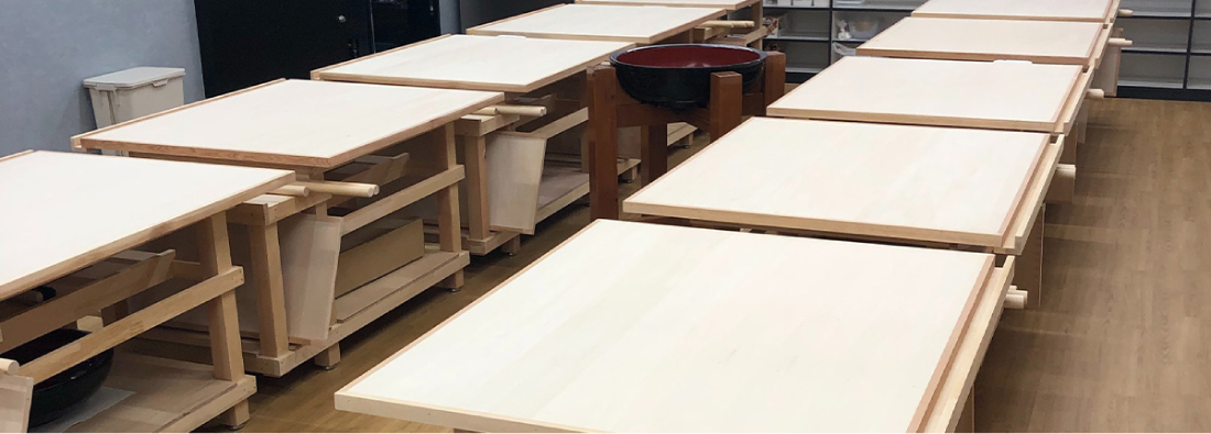 一人一台(計 10 台)のそば打ち台・各種道具を完備。